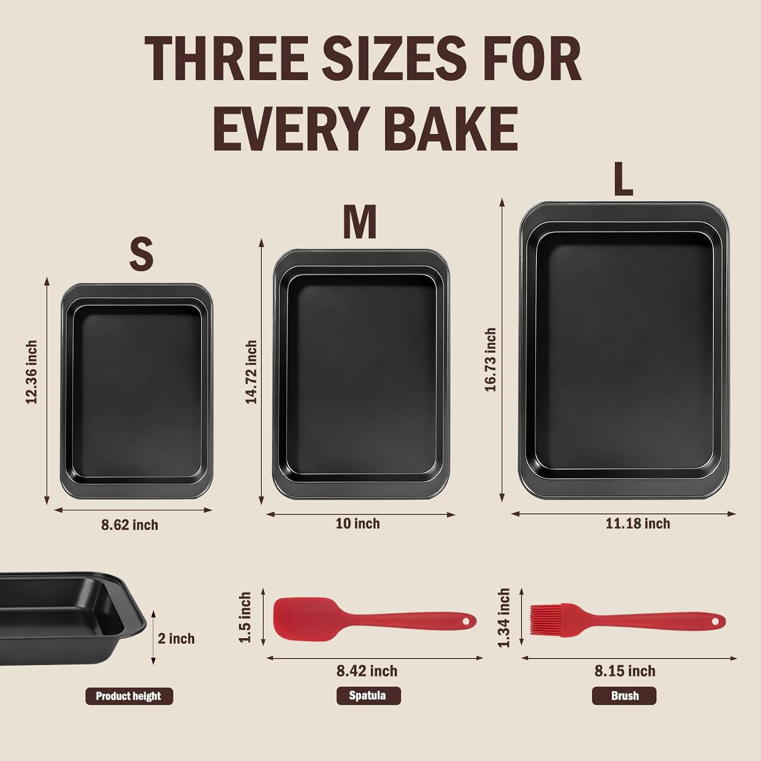 • 3 Sizes + Bonus Tools:This rectangle bakeware set includes 3 versatile sizes: S(12.36×8.62″), M(14.72×10″), L(16.73×11.18″), covering all your daily baking needs. It also comes with a bonus baking brush and spatula, making these sheet pans for baking more practical and user-friendly.