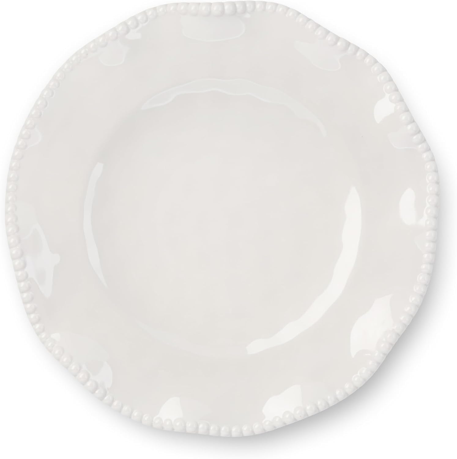 - The Off-White Set of 6 Heavyweight Melamine Dinner Plates, designed for those who appreciate both beauty and durability. These plates are LARGE measuring 11 inches in diameter and are not suited for the microwave. These plates feature a scalloped edge and delicate beaded rim, creating a timeless elegance perfect for both casual and formal occasions. The soft Off-White color and hand-hammered texture add a sophisticated touch to any table setting, effortlessly complementing modern, rustic, and farmhouse décor.
